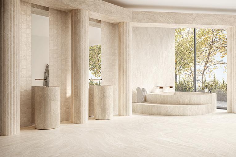 Emilceramica presenta Dual Travertine, la nueva colección inspirada en la doble alma del travertino cortado en sentido transversal a la veta: una auténtica y natural, que atesora la esencia originaria del travertino, y otra pulida y compacta, modelada por la mano del hombre. Dos almas, múltiples expresiones. La colección se articula en dos acabados: Poro Aperto, que conserva los poros naturales de la piedra, y Poro Chiuso, que los estuca tono sobre tono para conformar una superficie compacta y elegante. Ambos acabados están disponibles en dos tonalidades —White y Beige— luminosas, equilibradas y en perfecta sintonía con la materia.