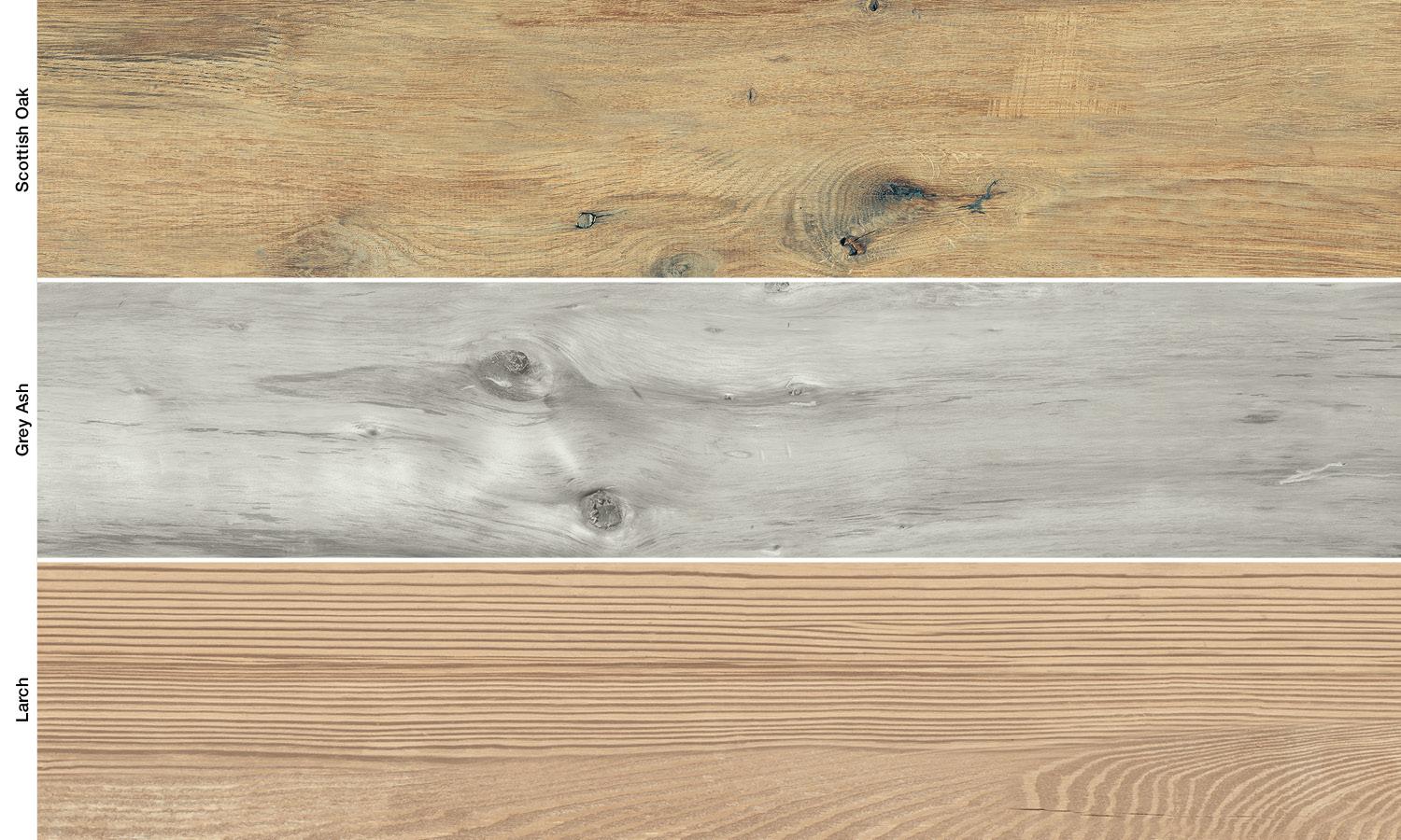 Tres tipos - originarios de regiones diversas del mundo, de vetas y superficies perfectamente reproducidas— con los que revestir espacios contemporáneos y sofisticados. Scottish Oak (Escocia), Grey Ash (Japón) y Larch.