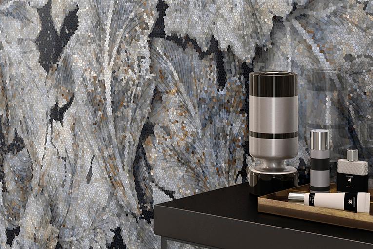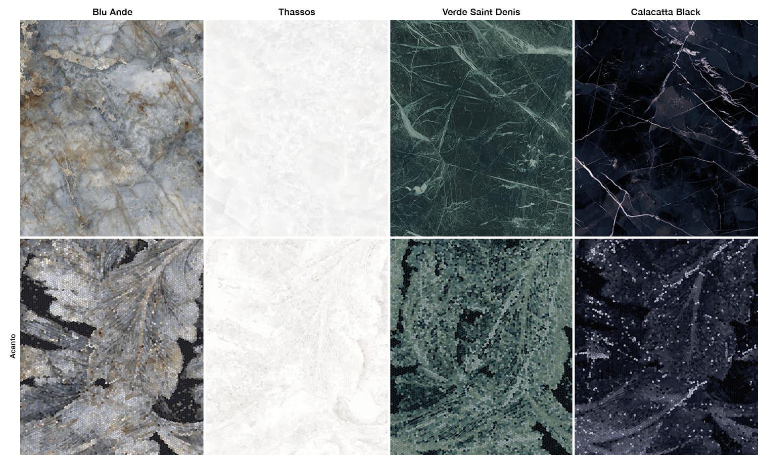 La serie introduce nuevos colores e inéditas combinaciones para realzar su expresividad: Thassos, Calacatta Black, Verde Saint Denis, Blu Ande. Cuatro nuevas propuestas de mármoles naturales y esmerilados hallan su máxima expresión en los formatos de grandes placas. Manejando colores y dibujos inéditos, el proyecto Tele di Marmo Revolution continúa la labor de reinterpretar el mármol en clave contemporánea e incorpora a la gama el dibujo Acanto. Aquí los ecos del mosaico artístico se expresan mediante el uso de trazos geométricos precisos y perfectamente calibrados tanto en los tonos como en los detalles. Con su intensa expresividad, esta decoración convierte el proyecto Tele di Marmo Revolution en una propuesta de revestimiento completa en la que los veteados, los reflejos y los detalles adquieren una personalidad capaz de dejar su huella en cada proyecto, único y original como una obra de arte. Un aparato decorativo de mosaicos enriquece ulteriormente la serie posibilitando la máxima versatilidad de colocación.