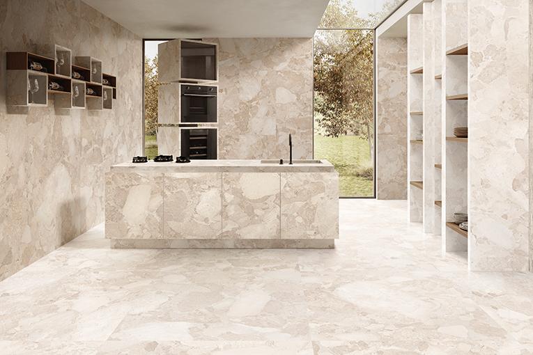 El Full Lappato presenta un grafismo dedicado que interpreta la piedra original una vez pulida, ofreciendo un elegante esplendor. En el acabado Naturale la materia se percibe llena de detalles, en parte gracias al uso de la tecnología exclusiva Digitouch en combinación con una estructura fina y delicada sincronizada con el grafismo básico. En el acabado Silktech, a las características de la versión Naturale se suma la típica suavidad y sedosidad al tacto que lo distingue. La decoración Ritmo aporta tridimensionalidad y movimiento a los espacios, gracias a una textura dinámica que juega con las diversas tonalidades del efecto piedra.