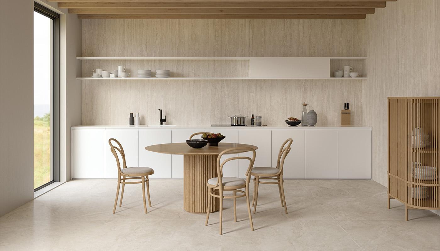 Una serie sugestiva y versátil, realizada en cuatro elegantes tonalidades articuladas en otros tantos acabados, que reinterpreta el travertino en una clave inédita y actual.