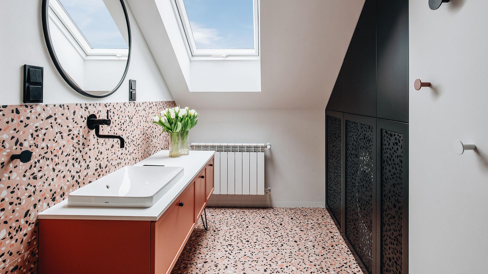 Precisamente por su particular ubicación, bajo un techo inclinado, este baño supuso un desafío único que la arquitecta del estudio FORMAlinia, Aleksandra Andrejkow, supo abordar con creatividad. Utilizando la tonalidad rosa de la colección Medley by Ergon, en los diferentes acabados Minimal, Rock y Classic, consiguió crear un ambiente acogedor y natural.