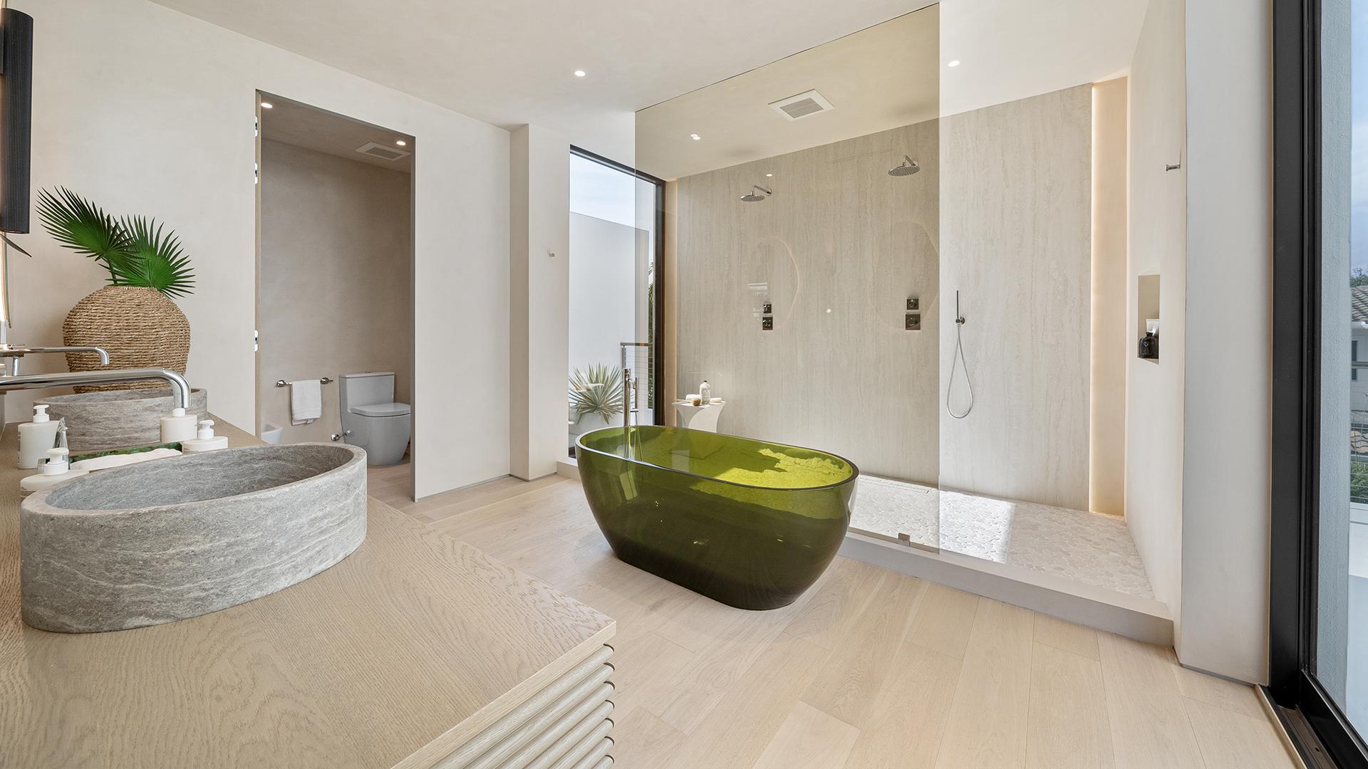 Un componente fundamental de este proyecto ha sido la selección de los materiales. En particular, los arquitectos han optado por los productos de gres porcelánico de Emilgroup para revestir los cinco baños de la residencia. Para el tocador se han utilizado las placas Level Onyx Green, que evocan los tonos de las aguas cristalinas. La colección Mapierre en la tonalidad Blanc ha creado un baño refinado y neutro, diferenciando con sus acabados Noble y Ligne el uso previsto de cada espacio. Para dos de los cinco baños de la residencia se han seleccionado los diferentes acabados de la colección Landscape, en los colores Avorio y Cenere, que han transmitido a los espacios una sensación de naturalidad y equilibrio, fundamental en un proyecto de este tipo. Las placas de Travertino Vein White de Level Stone, que reproducen las típicas vetas longitudinales del corte en el sentido de la veta, añaden un toque de lujo y refinamiento, completando así la atmósfera de cada baño con estilo y clase.