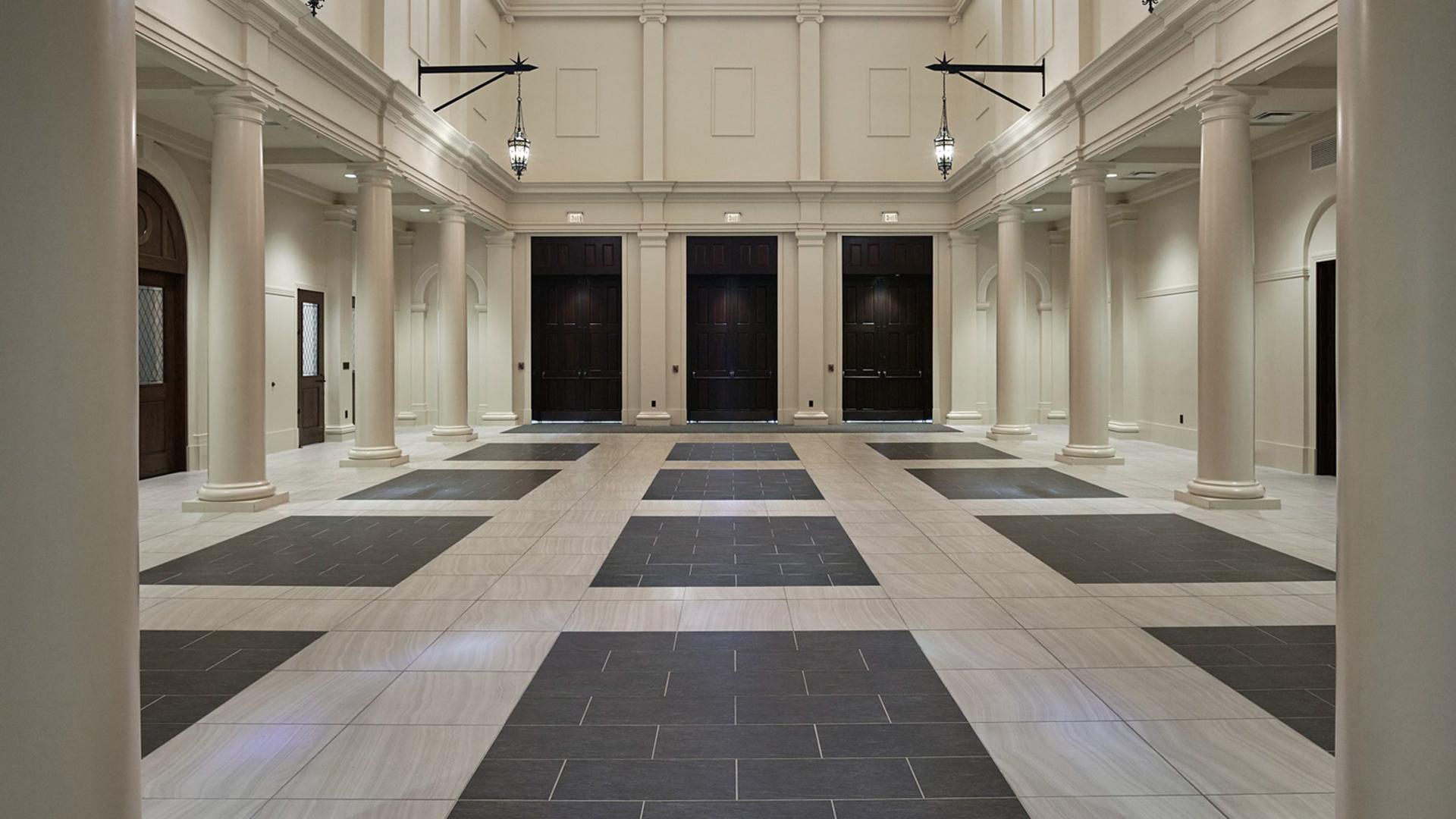 Las colecciones de Emilgroup seleccionadas por los proyectistas han permitido valorizar la estructura arquitectónica desde el punto de vista estético, si bien respetando los elevados requisitos técnicos exigidos. Q-Stone by Provenza responde a las exigencias del cliente eclesial con elegancia, belleza y practicidad. La línea dispone de tres colores en los tonos del gris y del beis, permitiendo crear juegos de luz sobre los azulejos. Además de un gran impacto estilístico la colección Q-Stone asegura unas altas prestaciones técnicas en lo que concierne a resistencia a la flexión, a las heladas y a los agentes químicos.