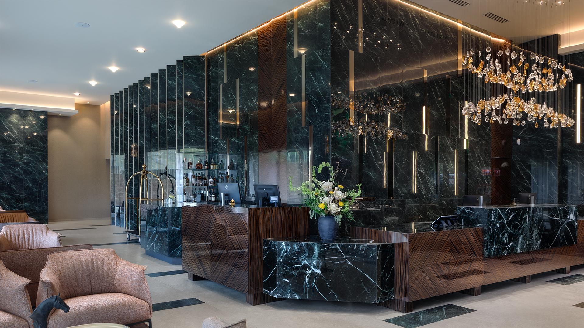 En este contexto, las colecciones de Emilgroup interpretan la pluralidad de los espacios con versatilidad: en el vestíbulo, la combinación de las colecciones de Emilceramica Mapierre y Tele di Marmo Revolution - Verde Saint Denis le da carácter e identidad al área de la recepción. Las superficies realizadas con Unique Travertine by Provenza, en la versión Vein Cut Cream, definen las áreas de bienestar con elegancia contemporánea, mientras que los espacios en torno a la piscina exterior, revestidos con Oros Stone by Ergon en la tonalidad Grey, crean ambientes donde prestigio y autenticidad se funden perfectamente.