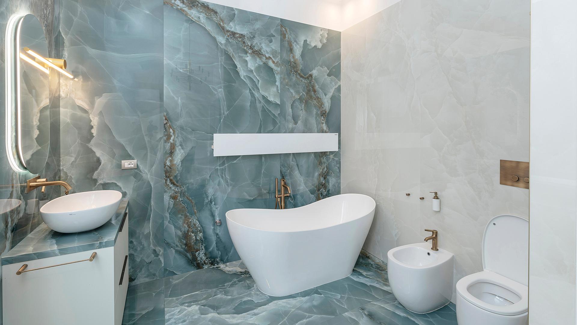 Un aspecto de este espacio que resulta especialmente fascinante es la bañera exenta, que se convierte en el punto central del baño, valorizado por la colección Onyx Green. Los tonos cálidos y los veteados naturales de los azulejos elegidos para este ambiente le aportan una sensación de lujo y sofisticación que se combina perfectamente con los acabados en oro y bronce utilizados. Este mismo lenguaje visual se emplea también el antebaño, con los revestimientos de Onyx Ivory y el suelo de Onyx Green, para ofrecer continuidad entre los espacios. Todos los detalles de este ambiente se han estudiado minuciosamente para crear un baño que, aun siendo funcional, representa sobre todo un lugar donde reinan la belleza y el bienestar.