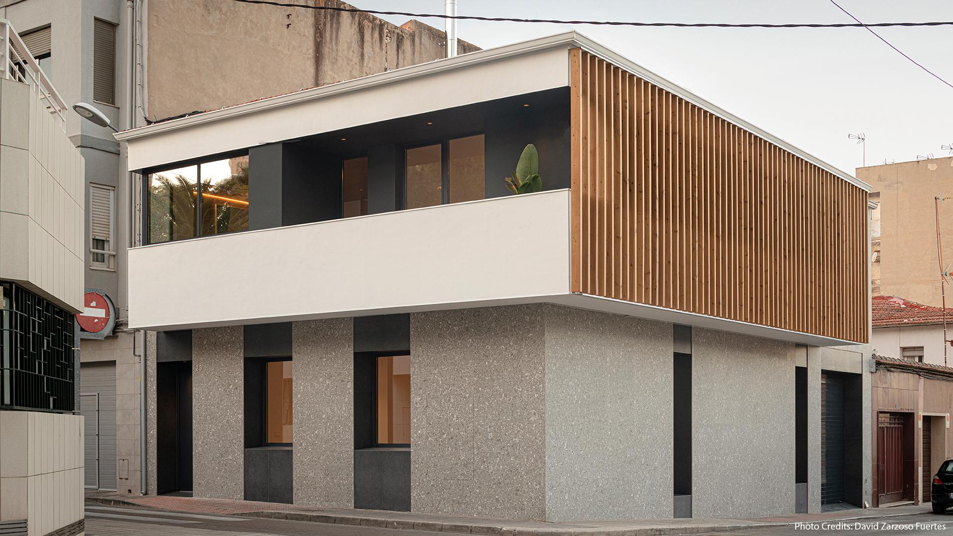 Para revestir las fachadas exteriores del edificio, el estudio de arquitectura ha seleccionado la elegante colección Lombarda by Ergon en el color Grigio, en el formato de 45 x 90 cm.