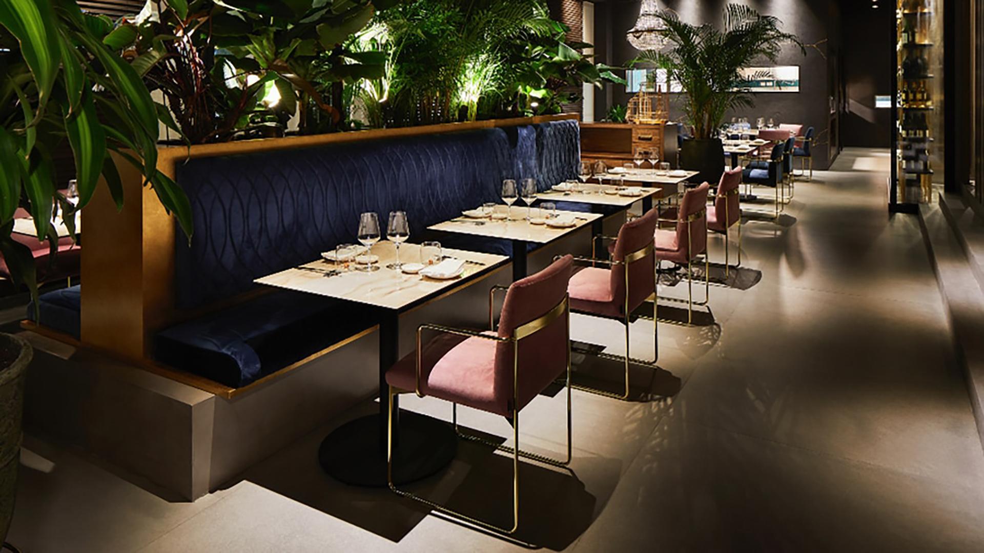 El objetivo era interpretar y transportar elementos característicos de la tradición del Sol Naciente realzando su elegancia y luminosidad. Para conseguirlo, el suelo del restaurante se ha revestido con azulejos Be-Square by Emilceramica, en el formato de 120 x 240 cm, en su variante Grey Concrete, que ha convertido la pavimentación en el fondo ideal para poner de relieve la tapicería de terciopelo y las mesas con espejos. Para vestir las paredes de la cocina se han elegido los Regoli Karman by Provenza, en el formato de 7,5 x 30 cm, con un efecto ladrillo. Los Regoli lisos de color petróleo, en perfecto estilo Provenza, interpretan el nacimiento de lo nuevo echando mano del arte del reciclaje y, gracias sus tonalidades verdes, generan sensación de continuidad visual con el jardín ideal Niwa. La selección de un material sostenible como el gres porcelánico ha permitido aunar belleza estética y virtudes técnicas tales como la facilidad de limpieza y de mantenimiento.
