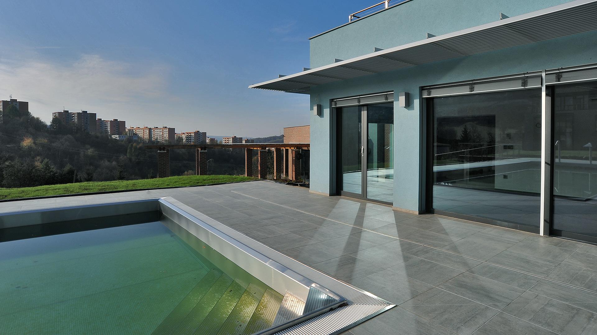 Para el revestimiento de la piscina del complejo residencial Zlin se ha seleccionado la colección Re-Use de la firma Provenza. La imitación del cemento, los colores y los dibujos esenciales brindan un diseño natural y moderno, un estilo sobrio y minimalista.
