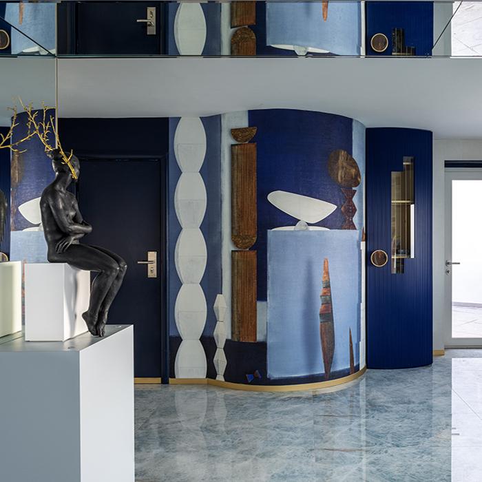 La combinación de cristales y ágatas que distingue la colección Tele di Marmo Precious ha transformado la Art Suite en un nido de lujo con el máximo confort. Las superficies elegidas en la tonalidad Azure han propiciado la creación de una atmósfera relajante, que evoca el romper de las olas contra las rocas.