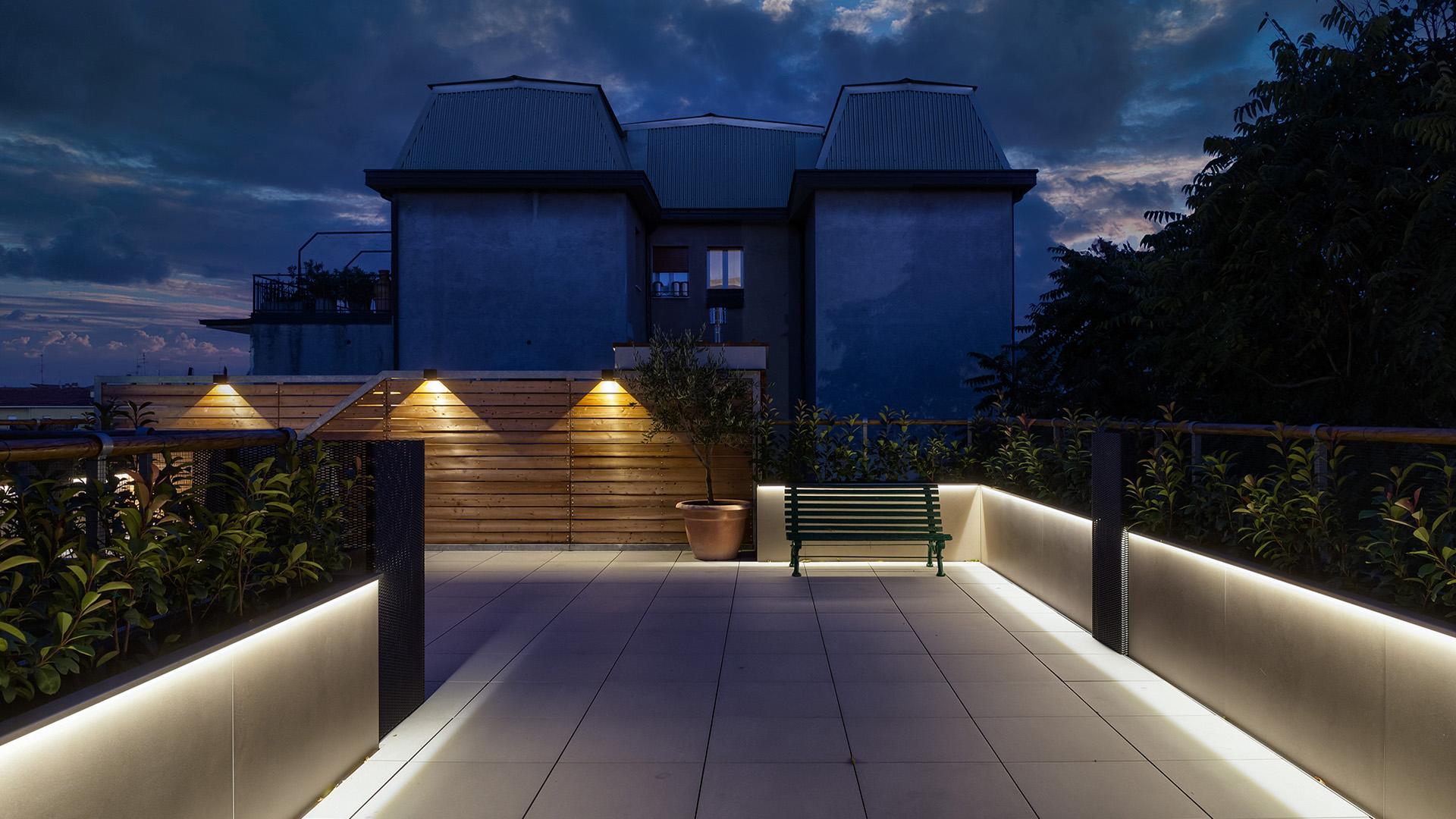 Para pavimentar el suelo se ha elegido la colección Stone Talk by Ergon en el formato de 60×60 cm, de 20 mm de grosor: el acabado minimal, en el color Grey, enfatiza la elegancia de la piedra esencial y auténtica. Las jardineras que rodean esta zona se han revestido con la colección Tr3nd, en el formato de 120×120 cm, color Taupe: la imitación del cemento, moderna y contemporánea, realza los ambientes y construye un diálogo con el espacio alrededor. La elegancia de la nueva terraza cobra aún más fuerza expresiva gracias a la amplia mesa realizada con las placas de cerámica Level Marmi, en la tonalidad Macchia Vecchia de 12 mm de grosor.