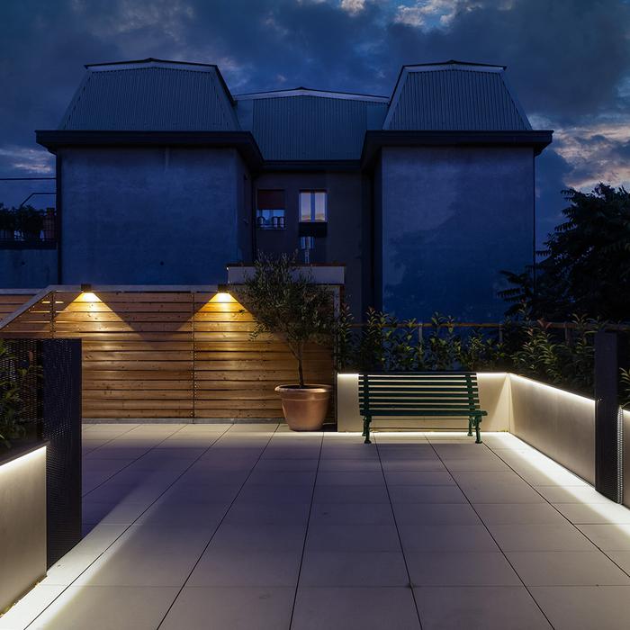 Para pavimentar el suelo se ha elegido la colección Stone Talk by Ergon en el formato de 60×60 cm, de 20 mm de grosor: el acabado minimal, en el color Grey, enfatiza la elegancia de la piedra esencial y auténtica. Las jardineras que rodean esta zona se han revestido con la colección Tr3nd, en el formato de 120×120 cm, color Taupe: la imitación del cemento, moderna y contemporánea, realza los ambientes y construye un diálogo con el espacio alrededor. La elegancia de la nueva terraza cobra aún más fuerza expresiva gracias a la amplia mesa realizada con las placas de cerámica Level Marmi, en la tonalidad Macchia Vecchia de 12 mm de grosor.